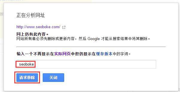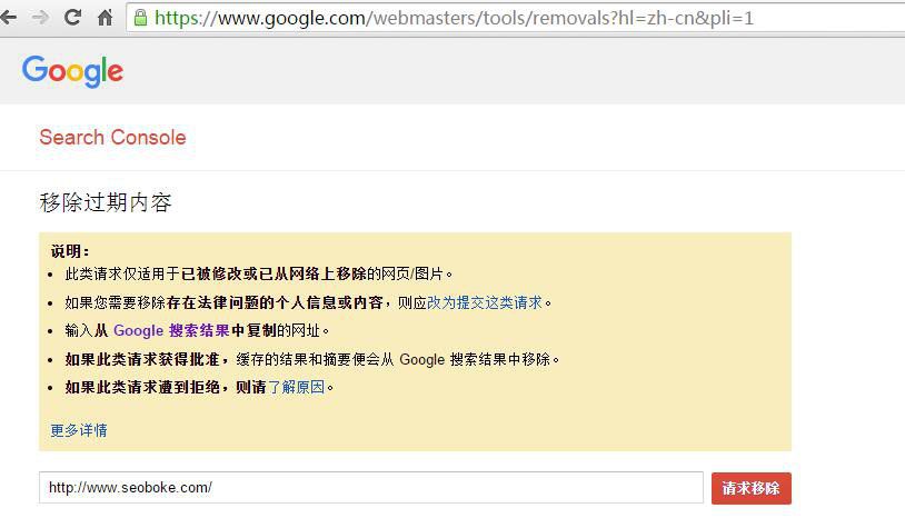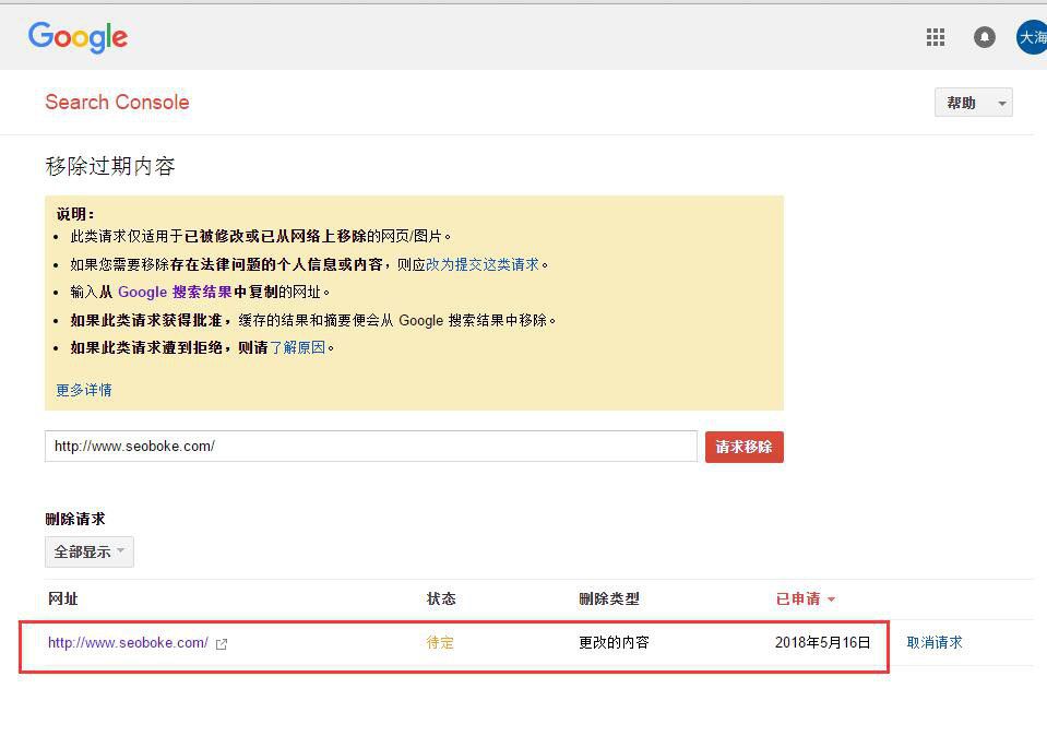 点击请求移除,下面就可以看到自己的申请记录了,等待谷歌更新即可